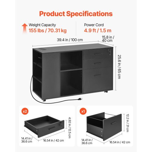 Number of Drawers: 3 Drawers with 5 Compartments,Weight Capacity:155 lbs / 70.31 kg,Color: Black,Item Model Number: KLHW-06,ProductDimensions: 39.4 x 15.8 x 25.6 in / 100 x 40 x 65 cm,Net Weight:64.8 lbs / 29.4 kg,Main Material: Particle Board