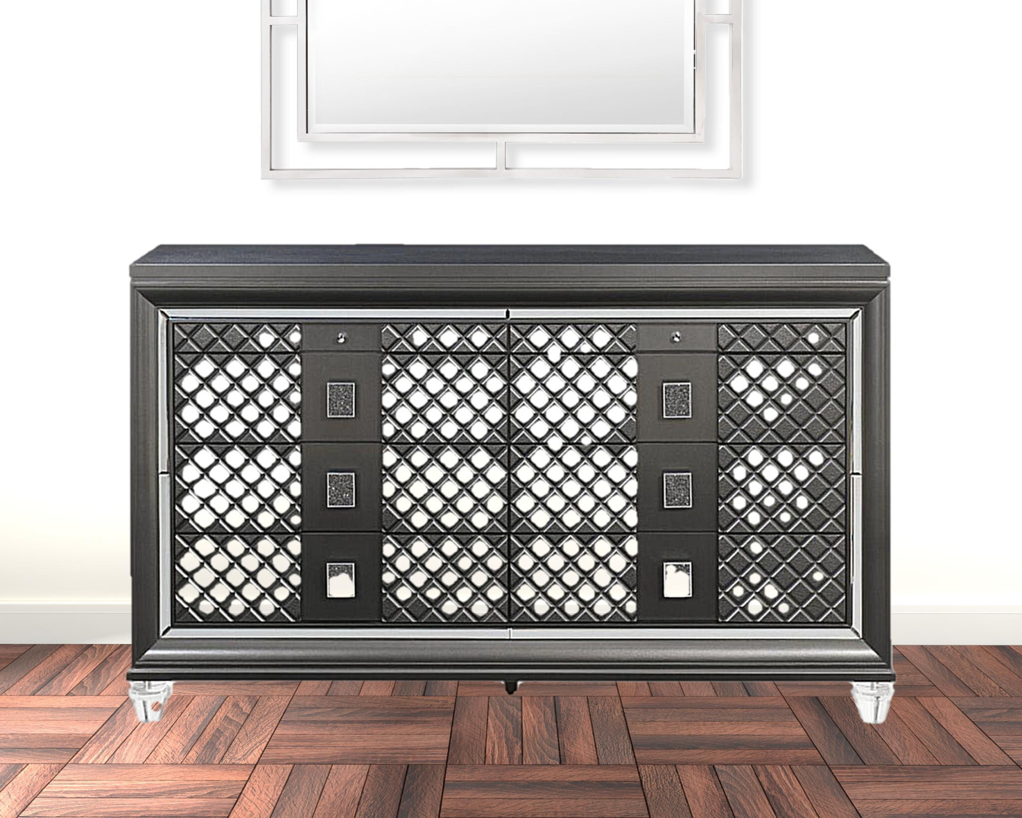 This 65-inch gray solid and manufactured wood eight drawer double dresser is a practical and good looking accent for your bedroom storage and organizational needs. This horizontal double dresser has column style drawers and a wide top surface area to help you with your daily dressing essentials. Loaded with capacity, this piece is equipped with eight easy open drawers for practical and good looking clothing storage. Its a high quality piece, made from high grade solid and manufactured wood. The gray coloration of this piece is neutral and will blend easily with most any decor. 40-inch H x 65-inch W x 18-inch D
