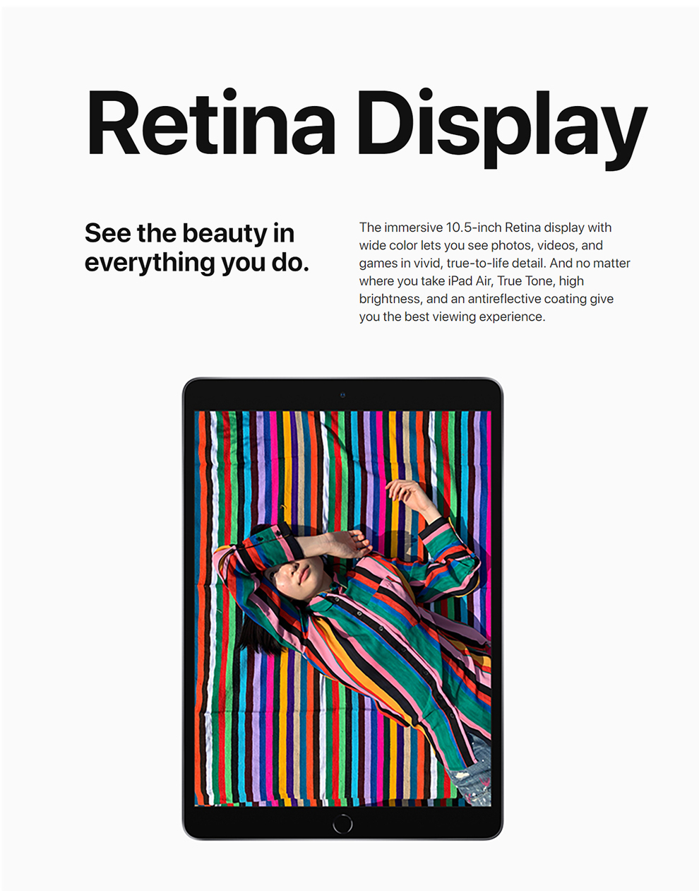 The immersive 10.5‑inch Retina display with wide color lets you see photos, videos, and games in vivid, true‑to life detail.